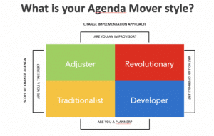 Your Agenda Mover style is a combination of your approach your change agenda (do you prefer to work with overhauling or tinkering goals?) and how you would like to implement your change agenda (do you prefer to plan or improvise?) Take the Agenda Mover Quiz to learn more about your tendencies toward change.